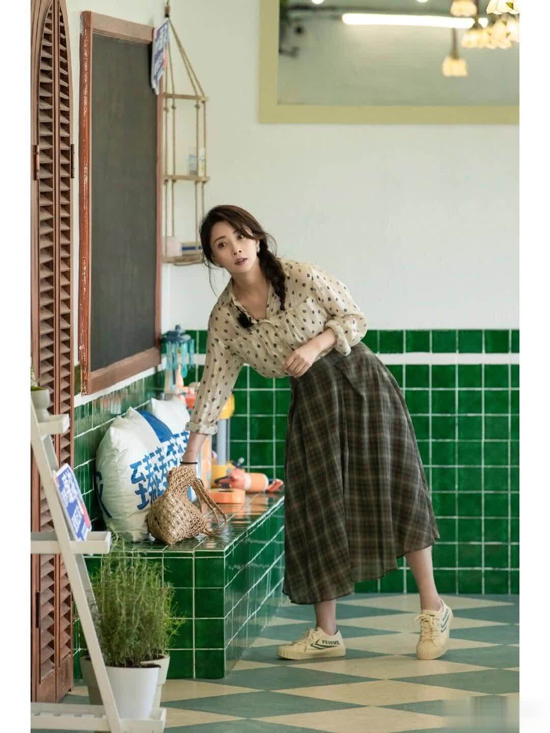 再来看这套波点衬衫搭配格纹半身裙的造型,仿佛将咱们带入了一个充满相沿文艺气味的天下。波点元素,当作前锋界旷日历久的经典元素,一直以来都以其俏皮、灵动的特色深受心爱。殷桃采用的这件波点衬衫,在材质上选择了轻微的雪纺面料,不仅一稔陶然,还增添了几分超逸感。