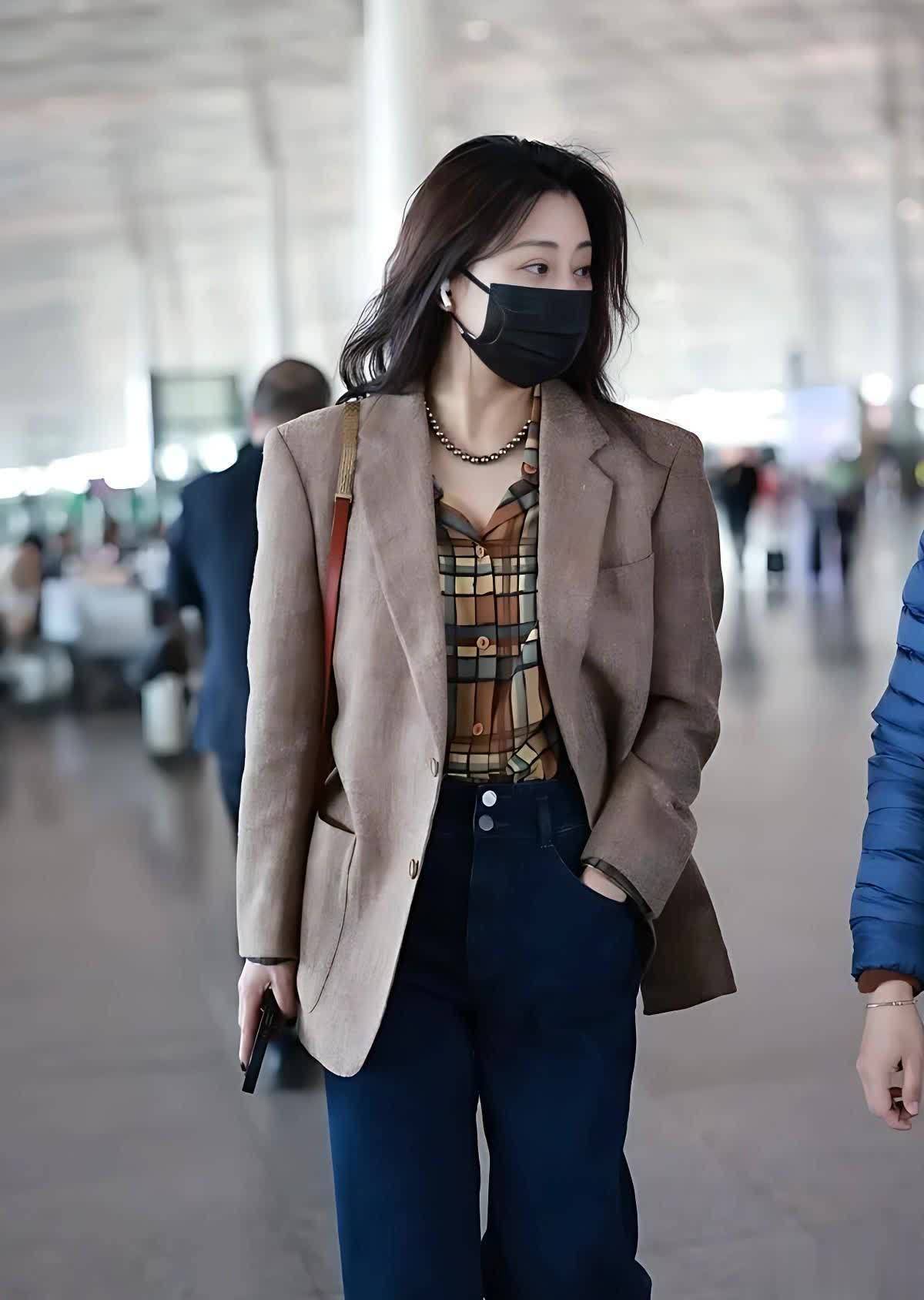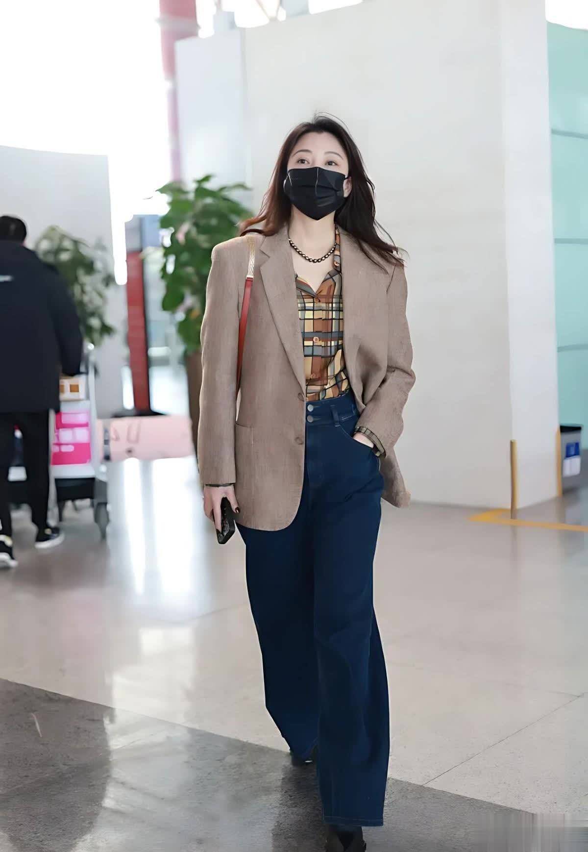 先来看殷桃这套宽松西装搭配深蓝色阔腿牛仔裤的造型,棕色西装当作地面色系中的经典代表,一直以来都以其千里稳、内敛的特色备受老练女性的心爱。殷桃采用的这件宽松版型的西装,在剪裁上深奥地弱化了传统西装的硬朗感,增添了几分马虎与洒脱。内搭的格纹衬衫则是点睛之笔,和西装变成了颜色上的脉络感。