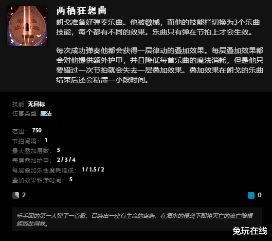 阿哈利姆神杖则会升级朗戈的终极手段“两栖狂念念曲”:朗戈在每次节拍时不错弹奏两首乐曲。每次两首乐曲同期弹在节拍上都会把柄律动的重复层数对近邻敌东说念主形成伤害,每层形成50 + 10/15/20点魔法伤害。