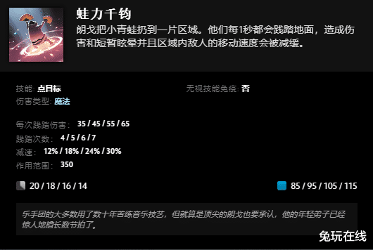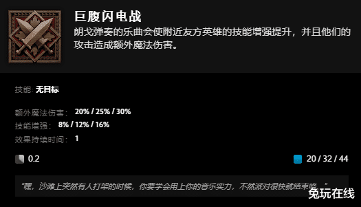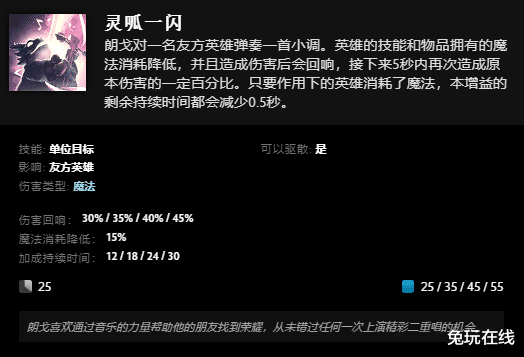 朗戈对又名友方英杰弹奏一首小调。英杰的手段和物品领有的魔法糟塌裁减,何况形成伤害后会回响,接下来5秒内再次形成正本伤害的一定百分比。只须作用下的英杰糟塌了魔法,本增益的剩余捏续时间都会减少0.5秒。