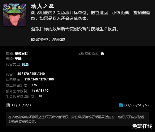朗戈在战场上能强化盟友,激勉他们高效施法,对敌东说念主形成更大的伤害。他能迅速收拢敌友,用他那条粘东说念主的舌头掌控战局,而他的小青蛙们也渴慕在他眼下横行直撞。当战役信得过尖锐化,朗戈会怡然走到台前,弹奏暗根族的经典曲目,为队友提供宏大的祈福,从而改变战况的基长入节律。