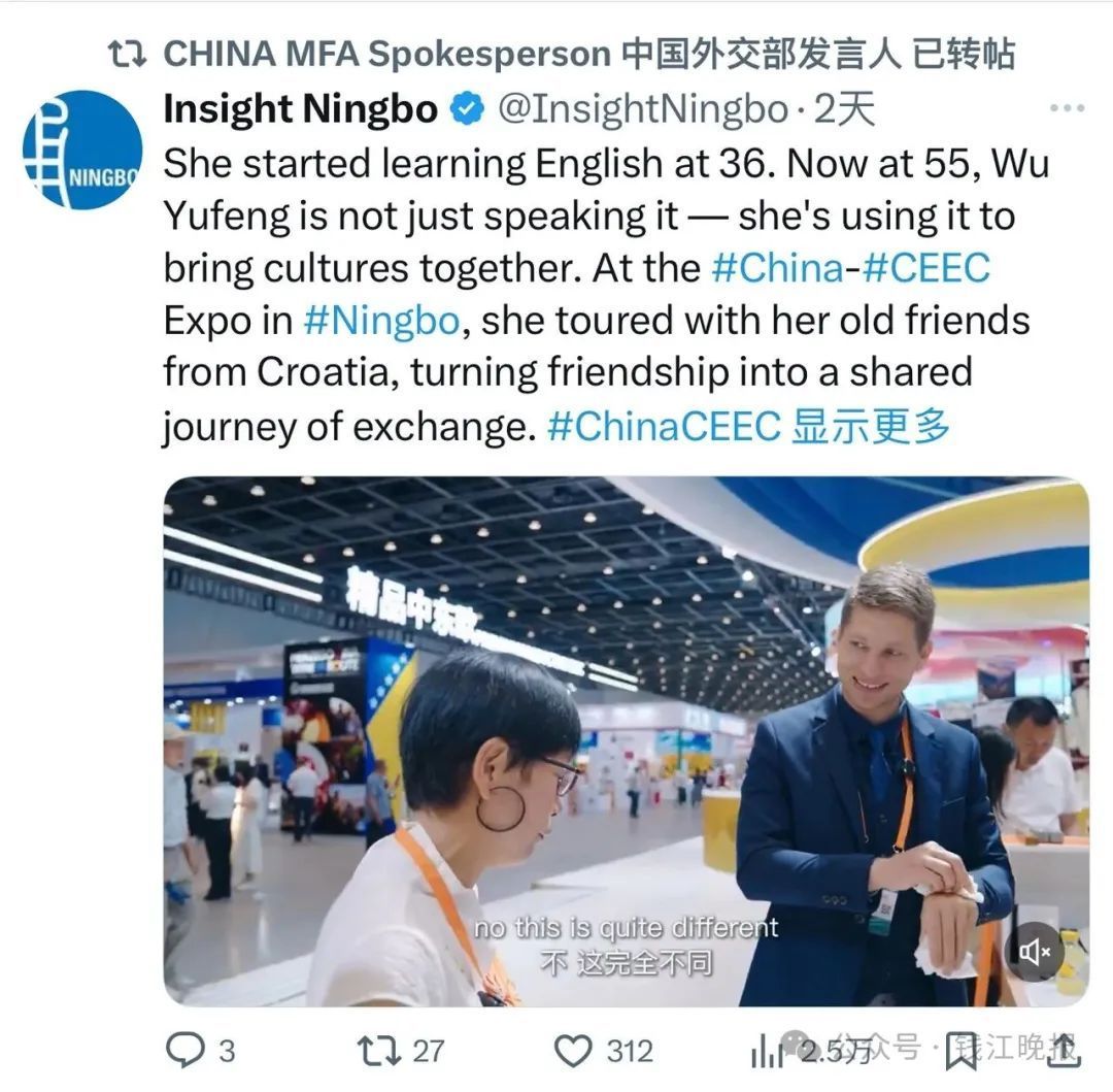 本年,她的身影和行状也在国际社交平台得到了中海酬酢部发言东说念主官方账号的转发和推介。